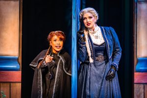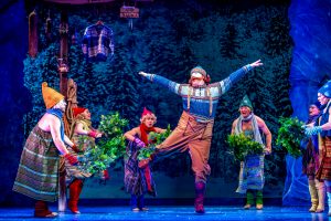 Photos: 1. Chariz Faulmino as Princess Anna and Kelly Holiff as Queen Elsa have found each other in the ice castle. 2. Lee Siegel, as shopkeeper Oaken, along with ensemble members, dance and sing. Photography by Dahlia Katz.