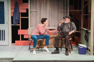 First of all, the set is perfect. A front porch of a home, or maybe a cottage, with only partial walls and hints of other building elements, the design evokes a lived-in feeling, with an added sense of loss. Set designer Joe Recchia says on an online post, “Walter’s house is partially stripped away, allowing us to peek inside his private world. The holes in the siding, as well as the cutouts onstage and empty picture frames inside the house, also parallel the holes in Walter’s memory.”