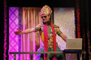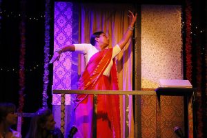 Picture this – you enter the Auburn Theatre — transformed into Mrs. Krishnan’s store — by an actual actor from the production. He introduces himself; you introduce yourself; he escorts you to your seat and introduces you to those sitting nearby. We are no longer theatre patrons; we are now guests. This unique production from the Indian Ink Theatre Company of New Zealand even offers options – you can sit centre stage at the VIP table, choose the front rows or even a bit back from the production in the “cheeky” seats. It all depends on how much you want to participate in the show. My sister Beth and I chose ‘cheeky” because I wanted to be sure I could check out all the action for this review. But even there, were given scarves to wear and balloons to toss and things to say. “Surprise” Mrs. Krishnan, your store is now a party floor for a crowd.