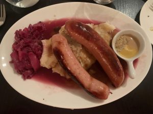 Dinner Theatre: For those interested in their delicious and generous menu items, they offer a full three- course dinner, with three choices in each of the three categories. I started with Caesar salad, my husband had the broccoli cheddar soup, and yes, we are that couple – we eat half and trade. For the main course, we both opted for the Oktoberfest style Bangers and Mash – huge delicious sausages (2 kinds), mashed potatoes and gravy with red cabbage. For dessert, I had pumpkin spice bread and butter pudding, while Victor had apple crumble, both with Kawartha Dairy ice cream. (We didn’t eat half and trade as we were each enjoying our own choice too much!)